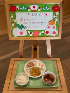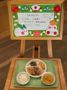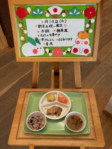 赤飯、雑煮風、モロの生姜やき、芋きんとん、紅白なます、麦茶